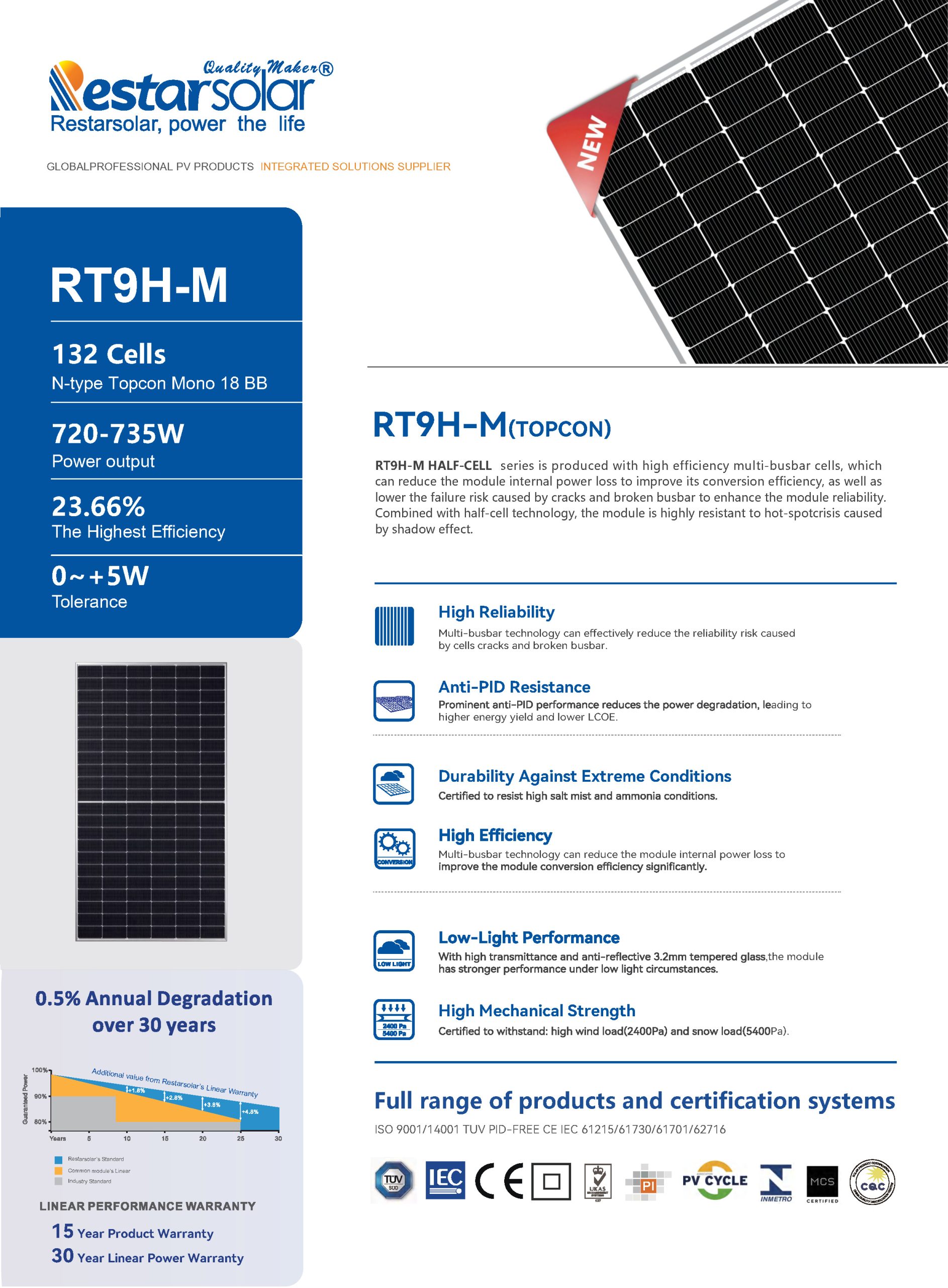 RT9H-M HALF-CELL series is produced with high efficiency multi-busbar cells, whichcan reduce the module internal power loss to improve its conversion efficiency, as well aslower the failure risk caused by cracks and broken busbar to enhance the module reliabilityCombined with half-cell technology, the module is highly resistant to hot-spotcrisis causedby shadow effect.